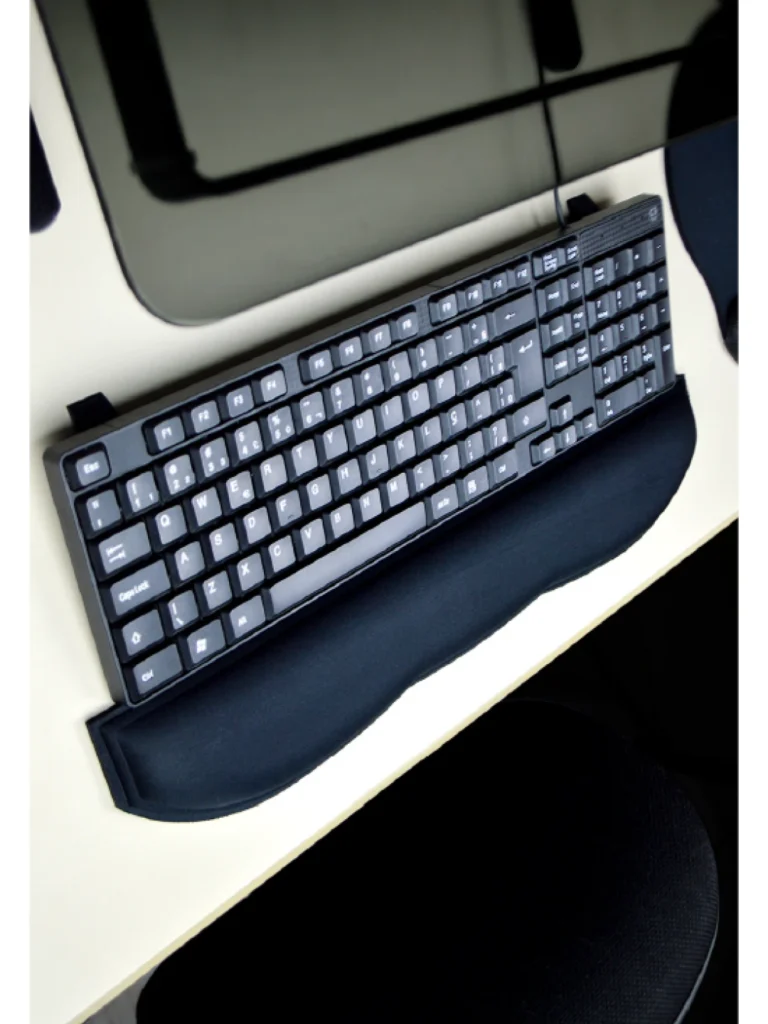 Design ergonômico com descanso para punho, ideal para evitar fadiga muscular e prevenir lesões por esforço repetitivo (L.E.R).